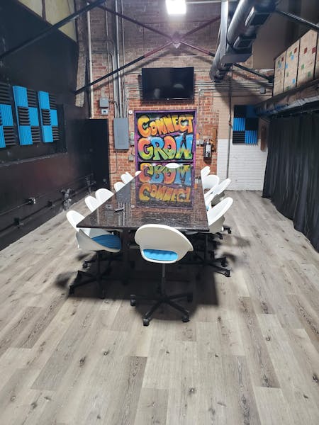 Our main conference room. Stand out at your next meeting by booking the conference room here at the Rise. 16' Granite conference table with seating up to 20 people. 30' vaulted ceiling with exposed brick…
